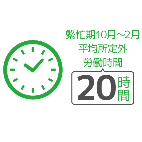 閑散期3月~9月はほとんど残業はなく、繁忙期10月~2月は月平均20時間程の残業がありますが、年々社員の作業効率が良くなり、減少傾向にあります。
